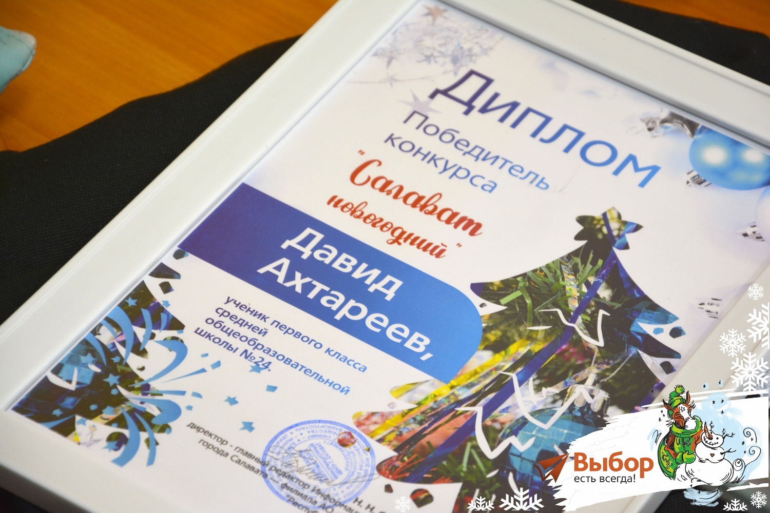 — Раз конкурс у нас новогодний, то и подарок должен быть соответствующим. А какое у нас есть самое зимнее угощение? Правильно, мороженое! Мы дарим тебе, Давид, нашу брендовую сумку «Салават – город чемпионов», наполненную этим новогодним лакомством, — сказала, вручая диплом и подарок, Надежда Фаррахова.