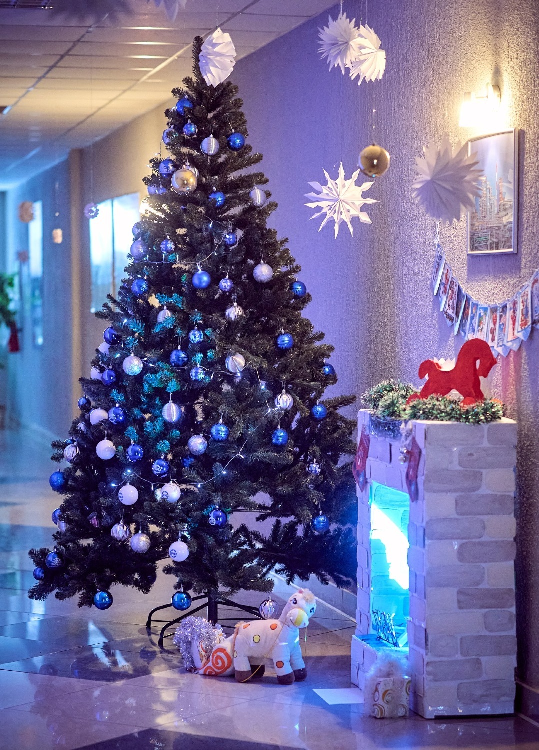 Центром новогодней локации стала зеленая красавица. Ее пушистые ветки украшали синие и серебряные игрушки, на которых вспыхивали огоньки гирлянды.