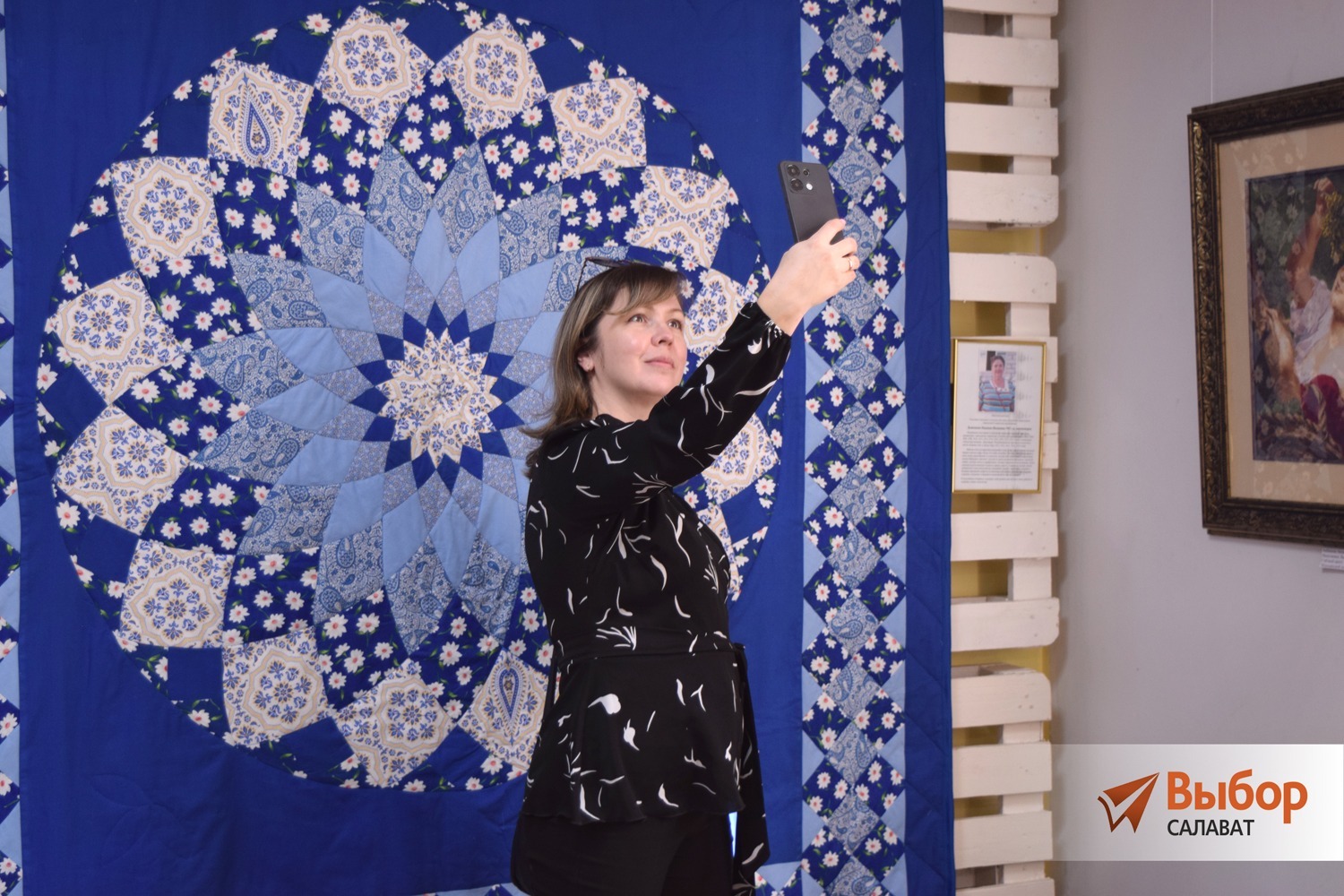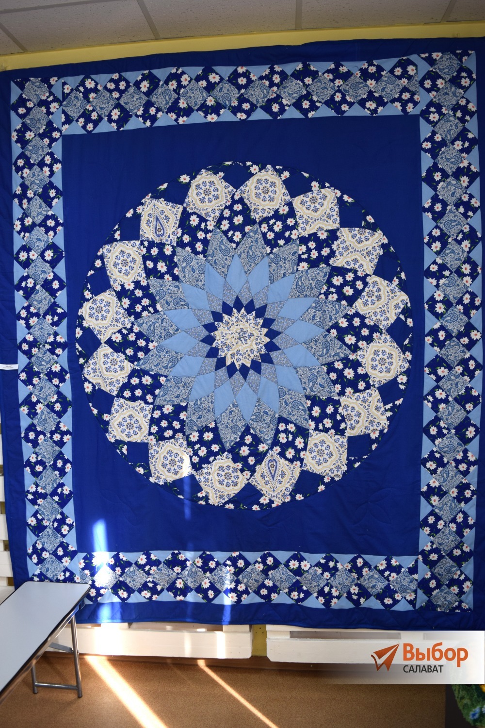 Два зала картинной галереи заняли работы, выполненные в различных техниках, от батика до войлоковаляния, но первое, что видели посетители, — большое лоскутное одеяло в сине-белой цветовой гамме. «Это однозначно — Гран-при», — перешёптывались участницы. Работа Надежды Дьяконовой притягивала взоры и вызывала искреннее восхищение. Одеяло, выполненное в технике лоскутного шитья, состоит из одного из самых сложных блоков — «Георгин». А ведь это один из самых эффектных и узнаваемых элементов в технике пэчворк, сочетающий в себе симметрию, сложность и визуальную глубину. Он состоит из множества треугольных клиньев и лепестков, расходящихся от центра.