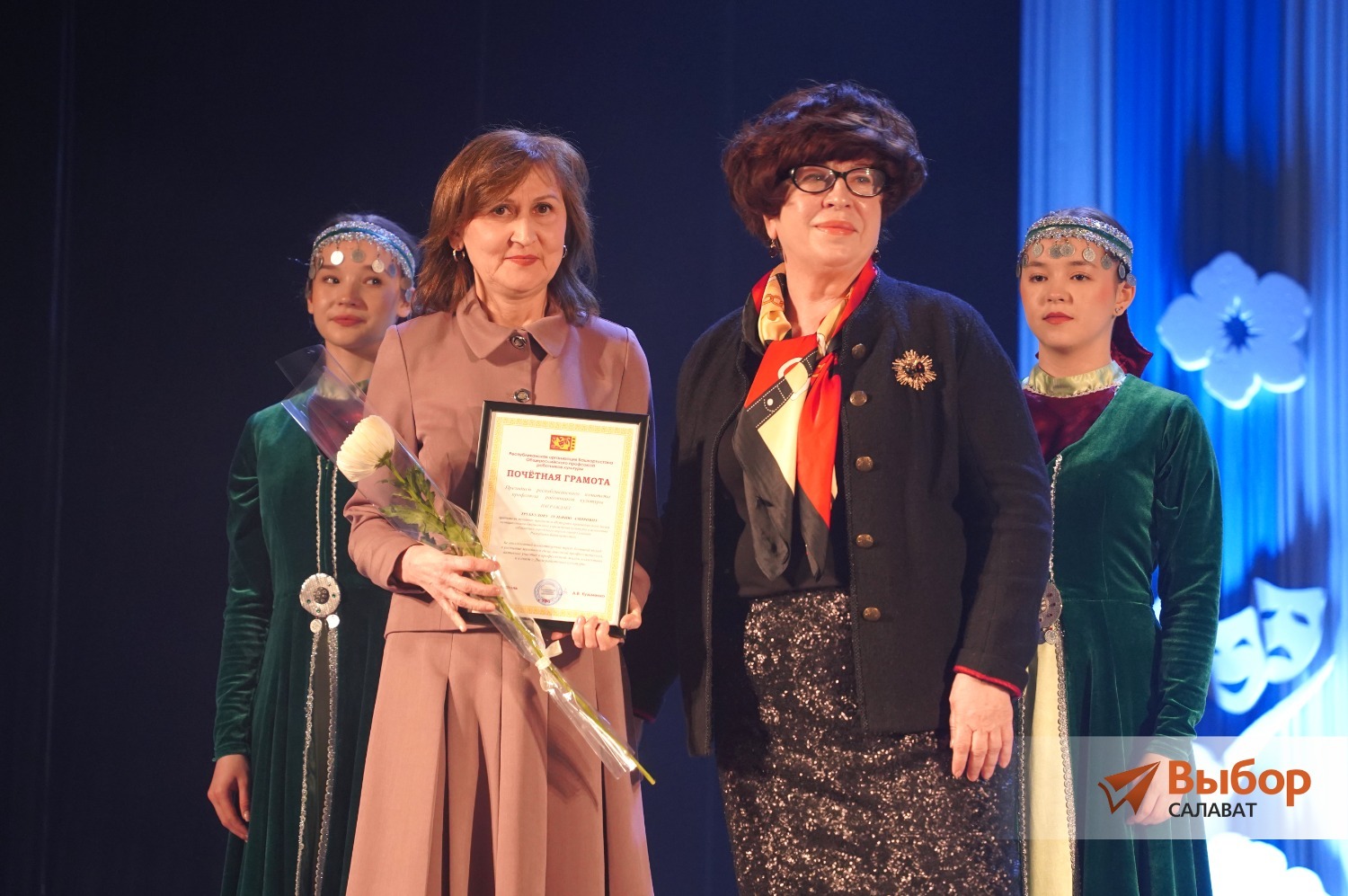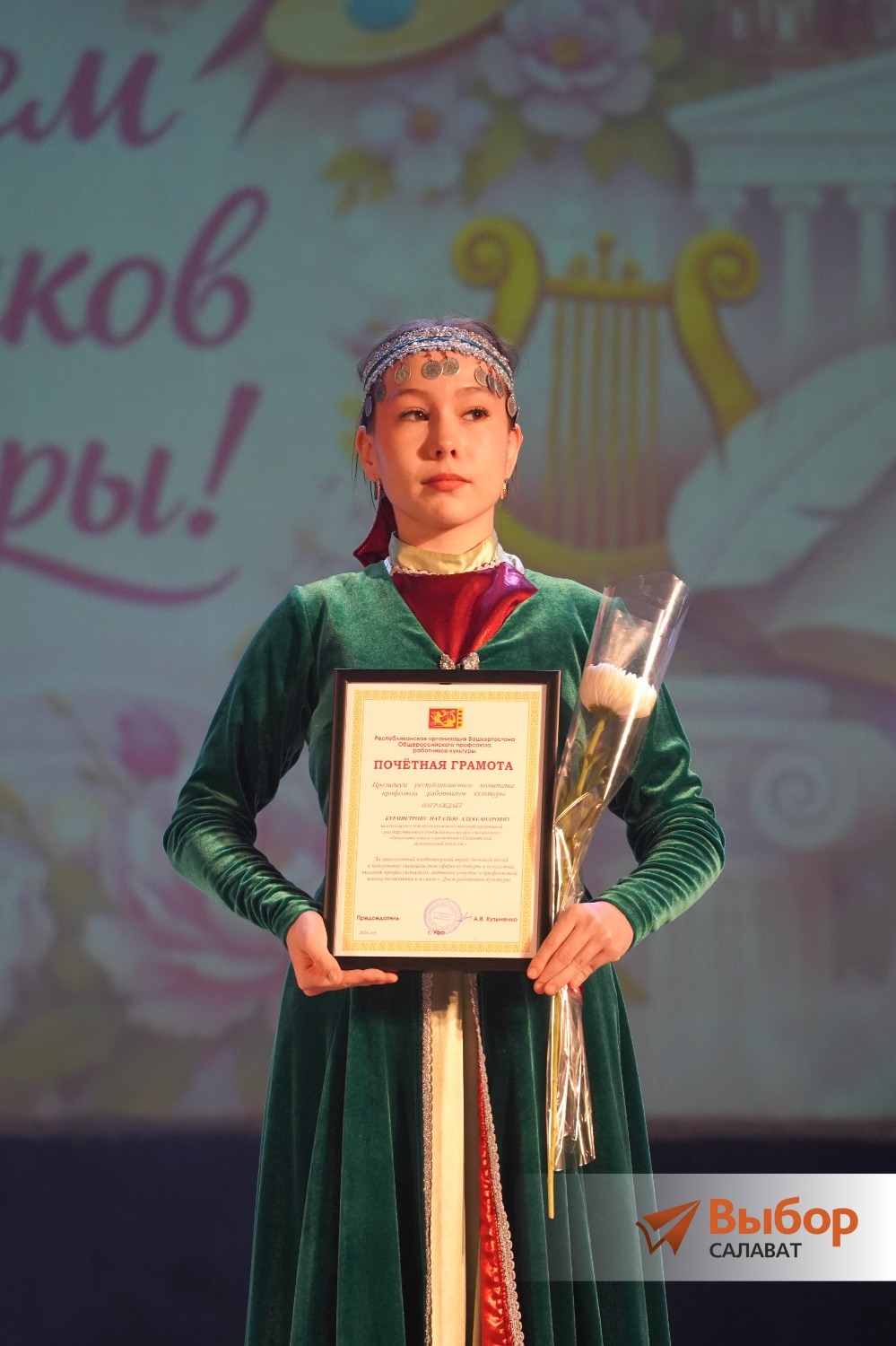 На праздничную сцену, чтобы не только поздравить работников сферы культуры, но и вручить Почетные грамоты Президиума организации, а также Благодарственные письма и Благодарности республиканского профсоюза, поднялась председатель Салаватского отделения Общероссийского профессионального союза работников культуры Ирина Кузовенкова.